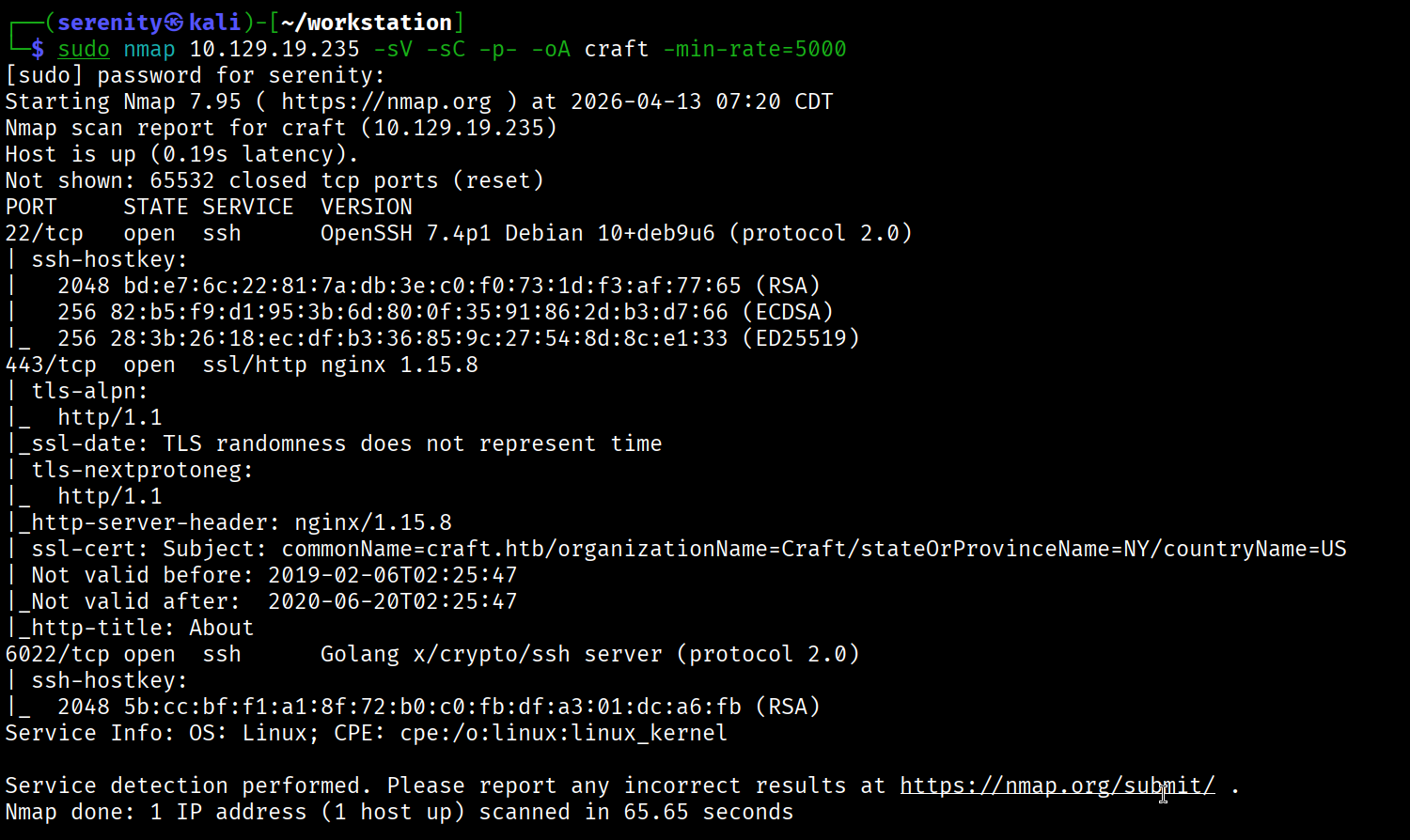 sudo nmap 10.129.19.235 -sV -sC -p- -oA craft -min-rate=5000