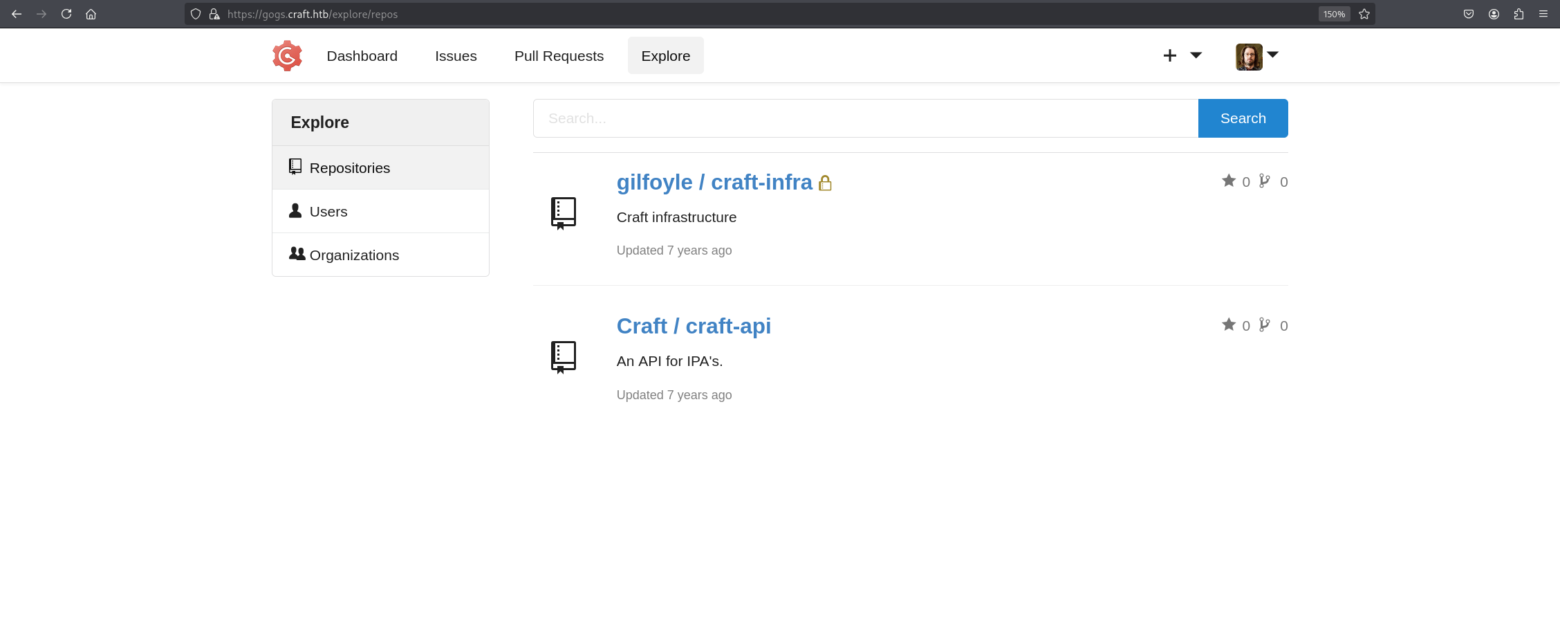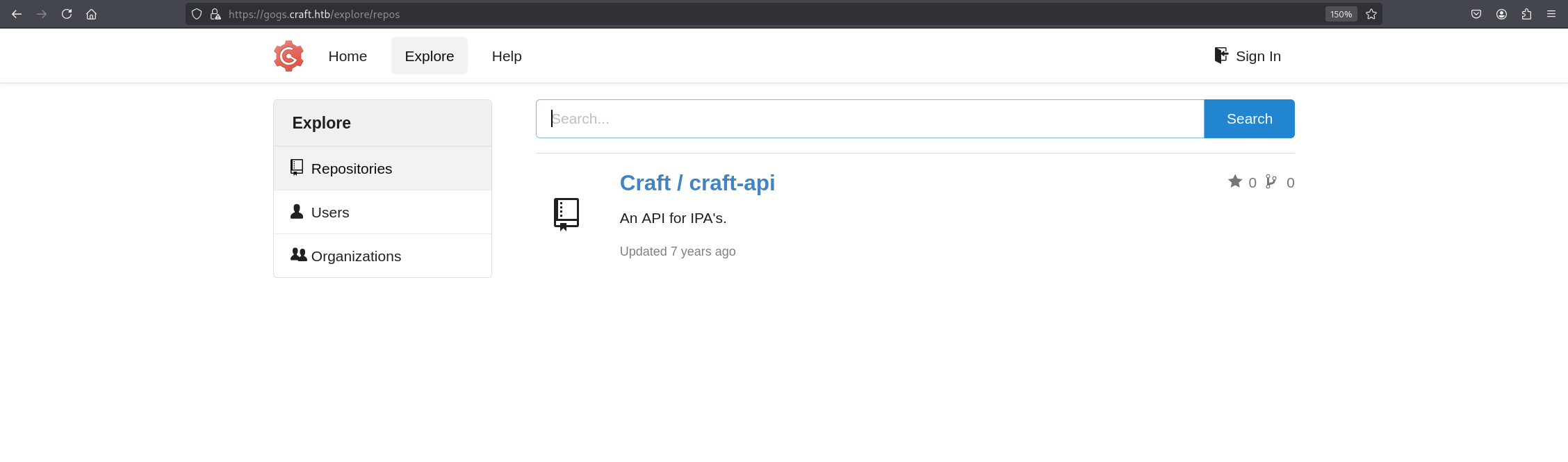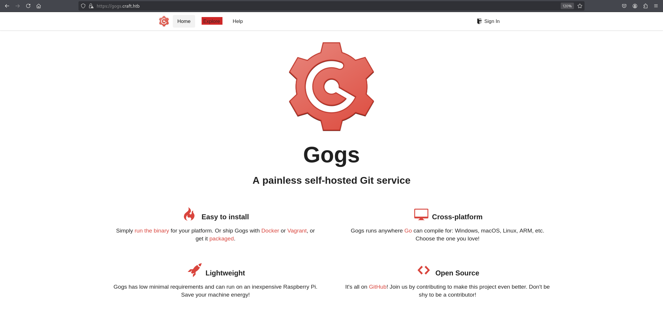 Browsing https://craft.htb/ will show us a website describing the company producing brews. We can see that they have left links to API and Git subdomains. We should add api.craft.htb and gogs.craft.htb to our /etc/hosts file. Once done, we can browse them. The API subdomain shows us REST API documentation—nothing interesting here. Let’s go to https://gogs.craft.htb we will see a Gogs instance, which is a self-hosting Git service with similar concepts to GitLab and GitHub.
