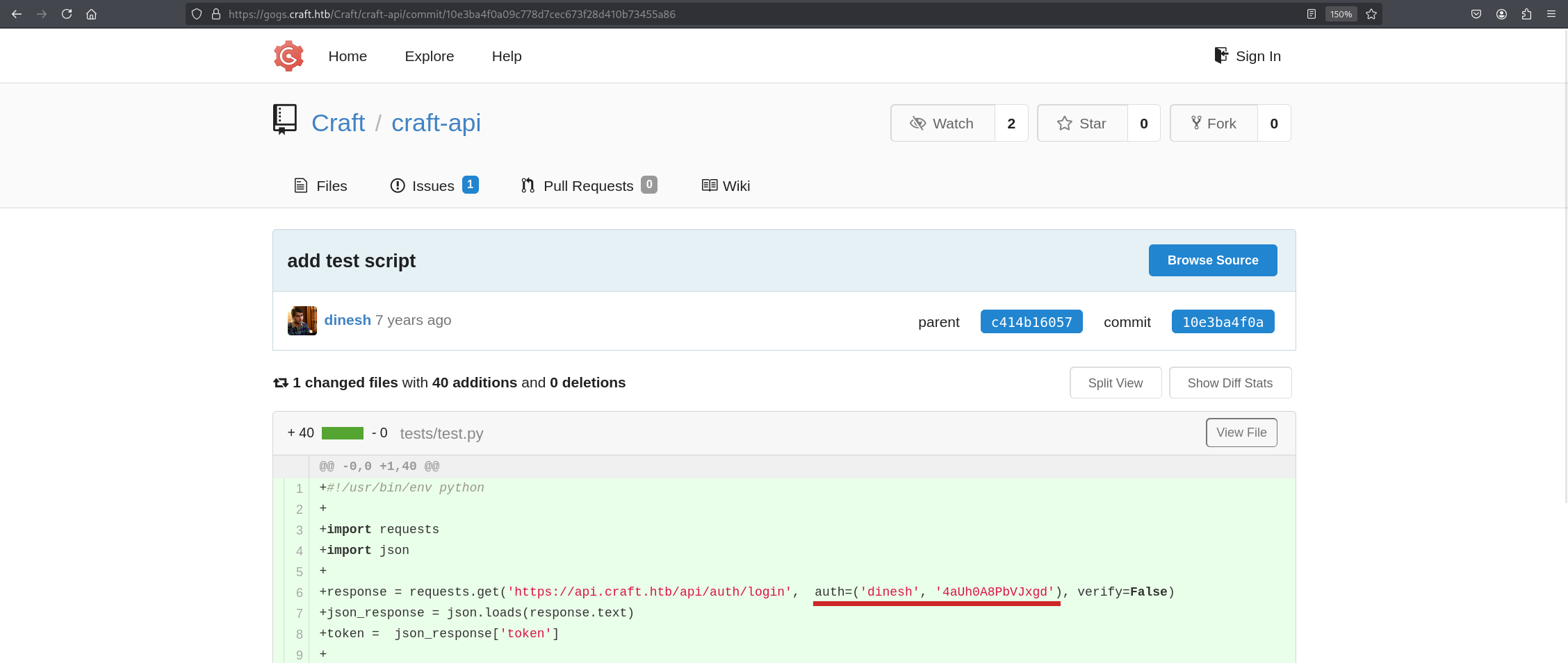 The error Invalid token or no token found means we should need to have credentials to access this API. Checking the craft-api repository again, we will see cleartext credentials for the API in the commits section.