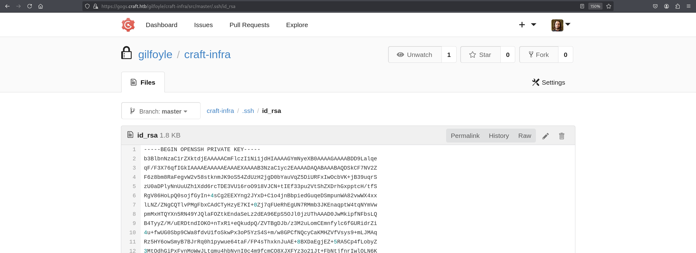 We can see that the gilfoyle user has an additional private repo called craft-infra and it holds private public keys for the user gilfoyle. Knowing password authentication is disabled in this SSH instance, we can quickly save the id_rsa private key to a file and try to authenticate with it.