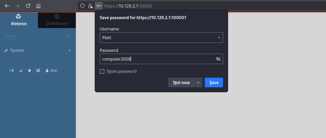 Now, earlier I mentioned how we can achieve Remote Code Execution via MiniServ 1.910 if authenticated. Why don’t we try Matt’s credentials on this service?